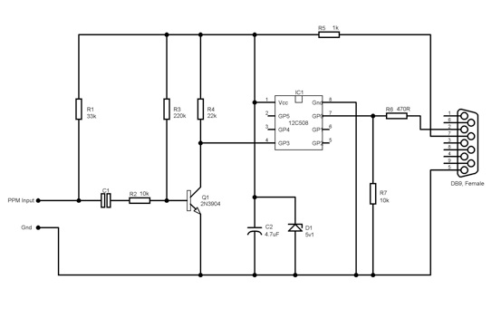 This is a brief description of the operation of the FMS PIC serial interface, the interface is design to take the buddy box output of PPM mode transmitters from Futaba, JR, Hitec and sanwa etc, and convert this output to an ASCII data string of the format listed below. It will only work with systems which operate over the range 1 - 2mS.